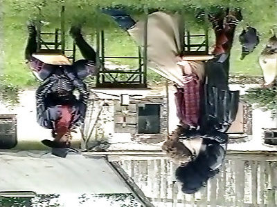 Super-naughty spandex dommes inspect slit of one plum doll outdoor