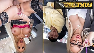 Faux Driving School - Hot Blondie busty MILF takes younger college age teen on a very driving test he will never forget