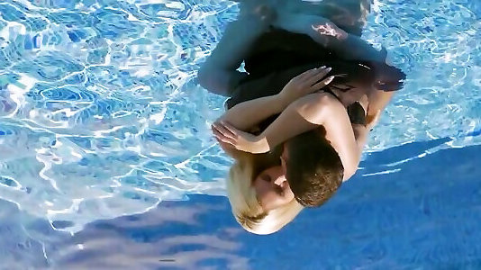 A platinum-blonde shoved the man into the pool so that he became humid, because her muff was already dribbling
