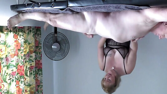 Muscled dominatrix punishes and abases immense marionette