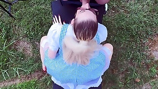 Horny Mature Milf rides Friend of her Hubby while her BFF make them wet with a garden Hose and takes cum in jaws