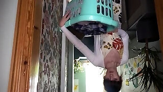 Super-hot housewife Lukerya. Fun flirting in the kitchen while sitting on the washing machine. Bottom view.